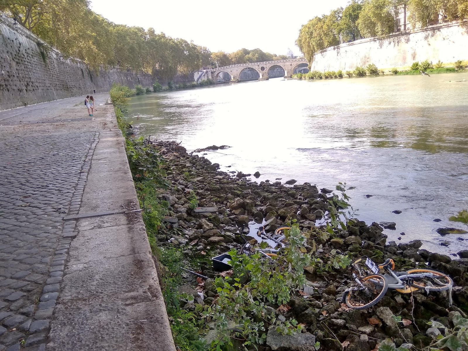 Где-то в районе Трастевере пообедали на 33 евро (2 пиццы, 1 л. вина, 2 тирамису и 1 кофе). Долго удивлялись, что 2 пиццы на троих заказали :) По реке пошли в Ватикан. В реке есть место с захоронением прокатных велосипедов